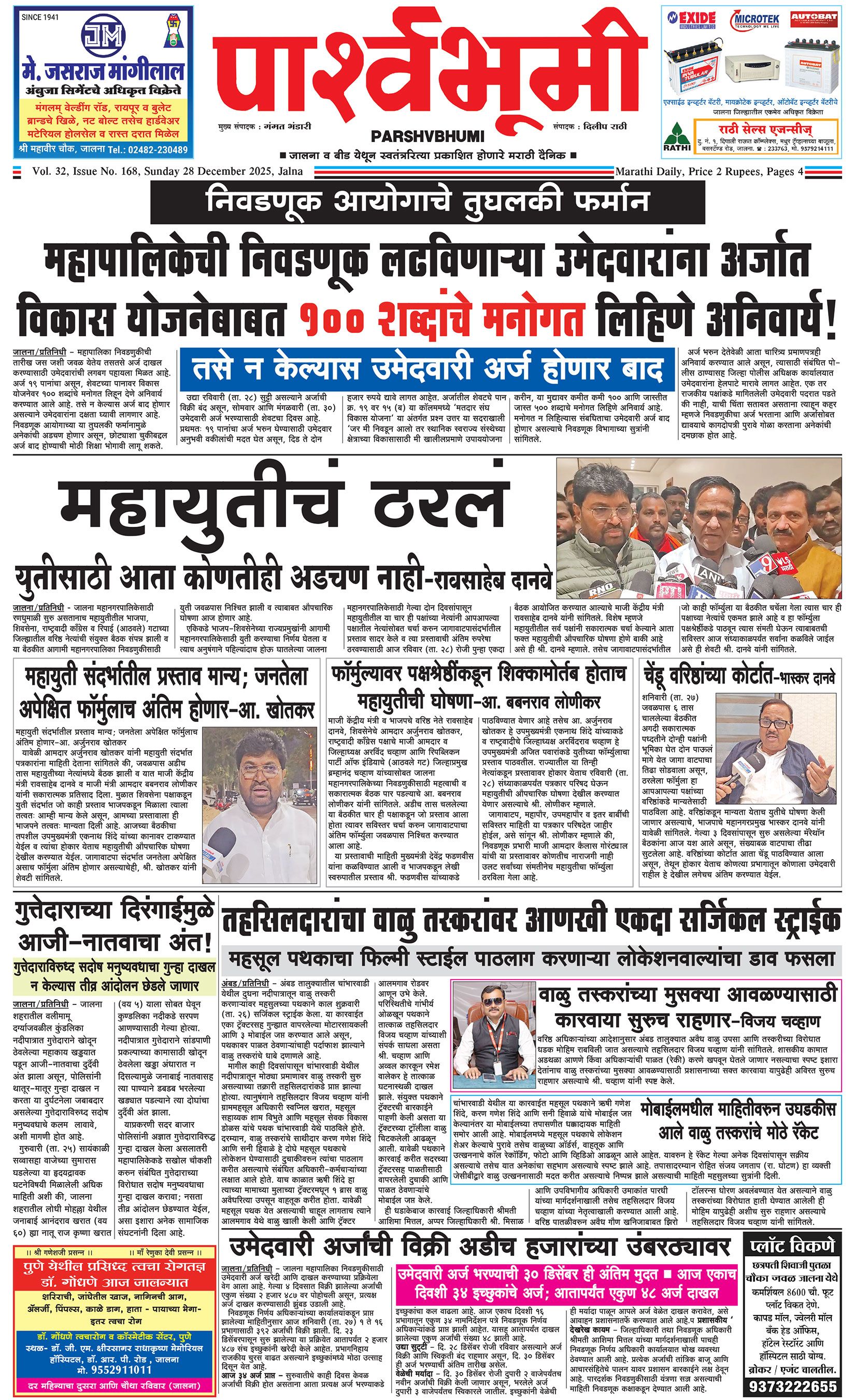 दैनिक पार्श्वभूमी | ‘विधाता’ बिल्डींग, आय. एम. ए. हॉलच्या पाठीमागे, प्रियदर्शनी कॉलनी, संभाजीनगर, जालना | ई-मेल : [email protected] | मो. 9860017155 Page 1 Page 2 Page 3 Page 4 Sunday, 28 December 2025