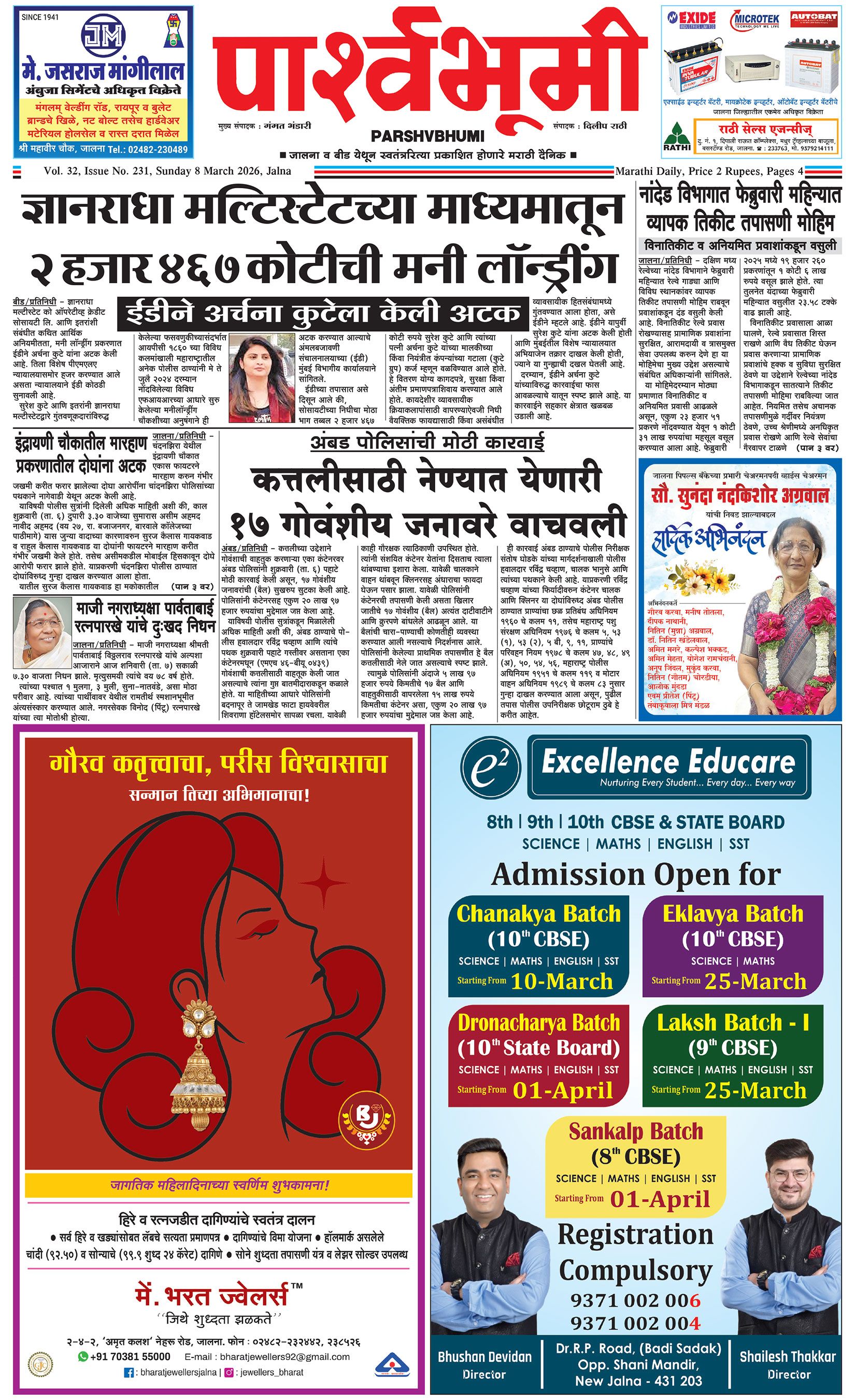 दैनिक पार्श्वभूमी | ‘विधाता’ बिल्डींग, आय. एम. ए. हॉलच्या पाठीमागे, प्रियदर्शनी कॉलनी, संभाजीनगर, जालना | ई-मेल : [email protected] | मो. 9860017155 Page 1 Page 2 Page 3 Page 4 Sunday, 8 March 2026