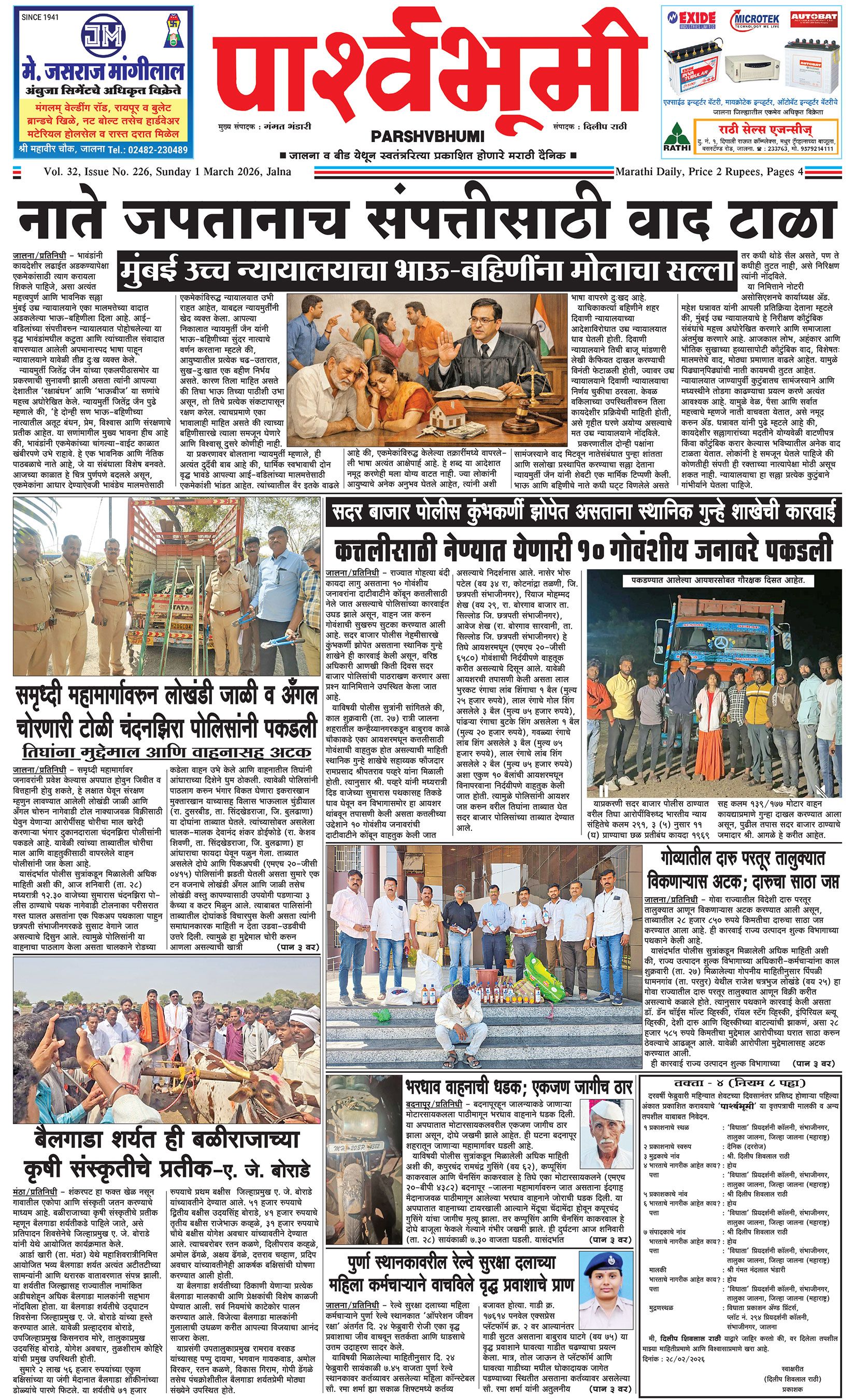 दैनिक पार्श्वभूमी | ‘विधाता’ बिल्डींग, आय. एम. ए. हॉलच्या पाठीमागे, प्रियदर्शनी कॉलनी, संभाजीनगर, जालना | ई-मेल : [email protected] | मो. 9860017155 Page 1 Page 2 Page 3 Page 4 Sunday, 1 March 2026