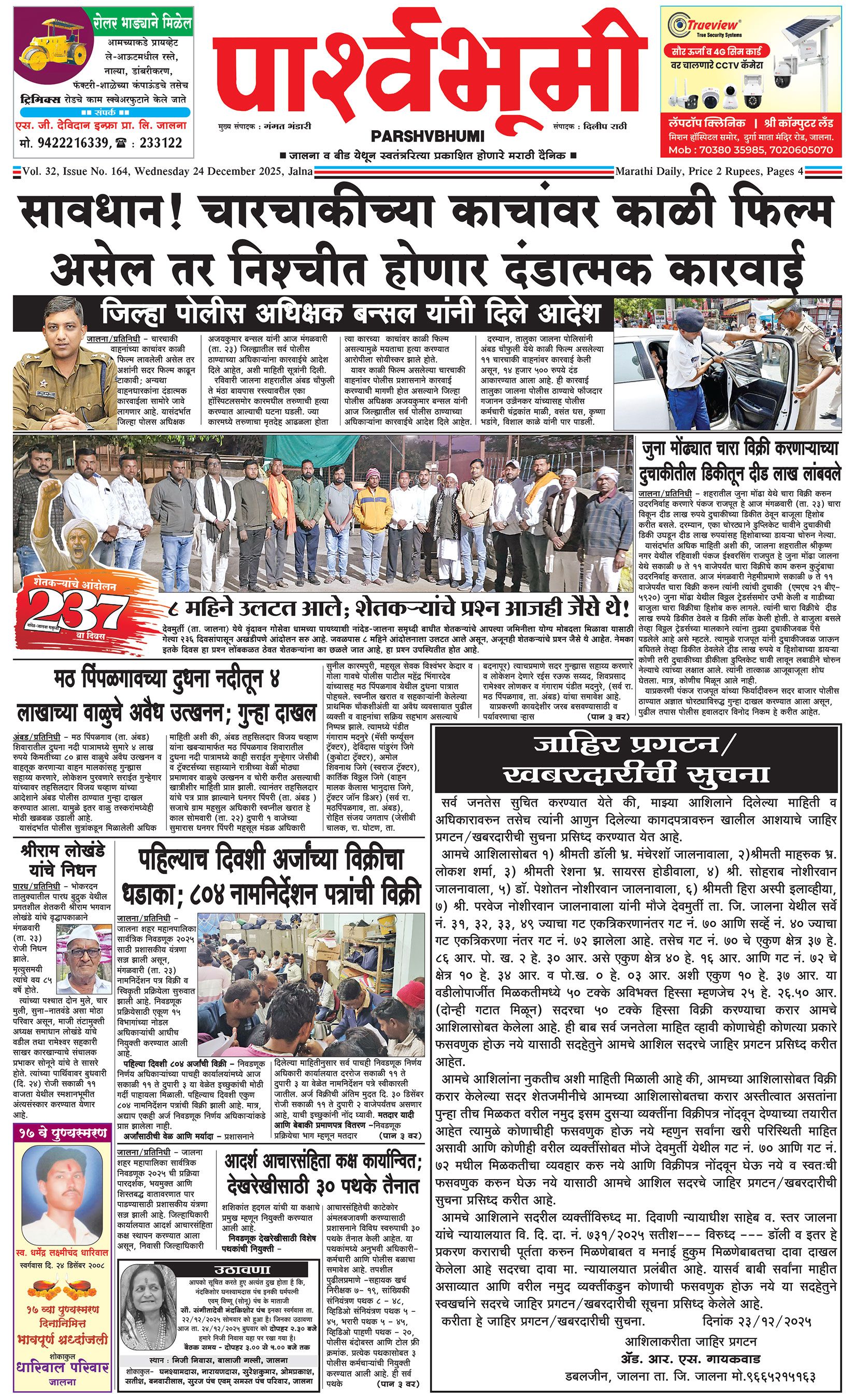 दैनिक पार्श्वभूमी | ‘विधाता’ बिल्डींग, आय. एम. ए. हॉलच्या पाठीमागे, प्रियदर्शनी कॉलनी, संभाजीनगर, जालना | ई-मेल : [email protected] | मो. 9860017155 Page 1 Page 2 Page 3 Page 4 Wednesday, 24 December 2025