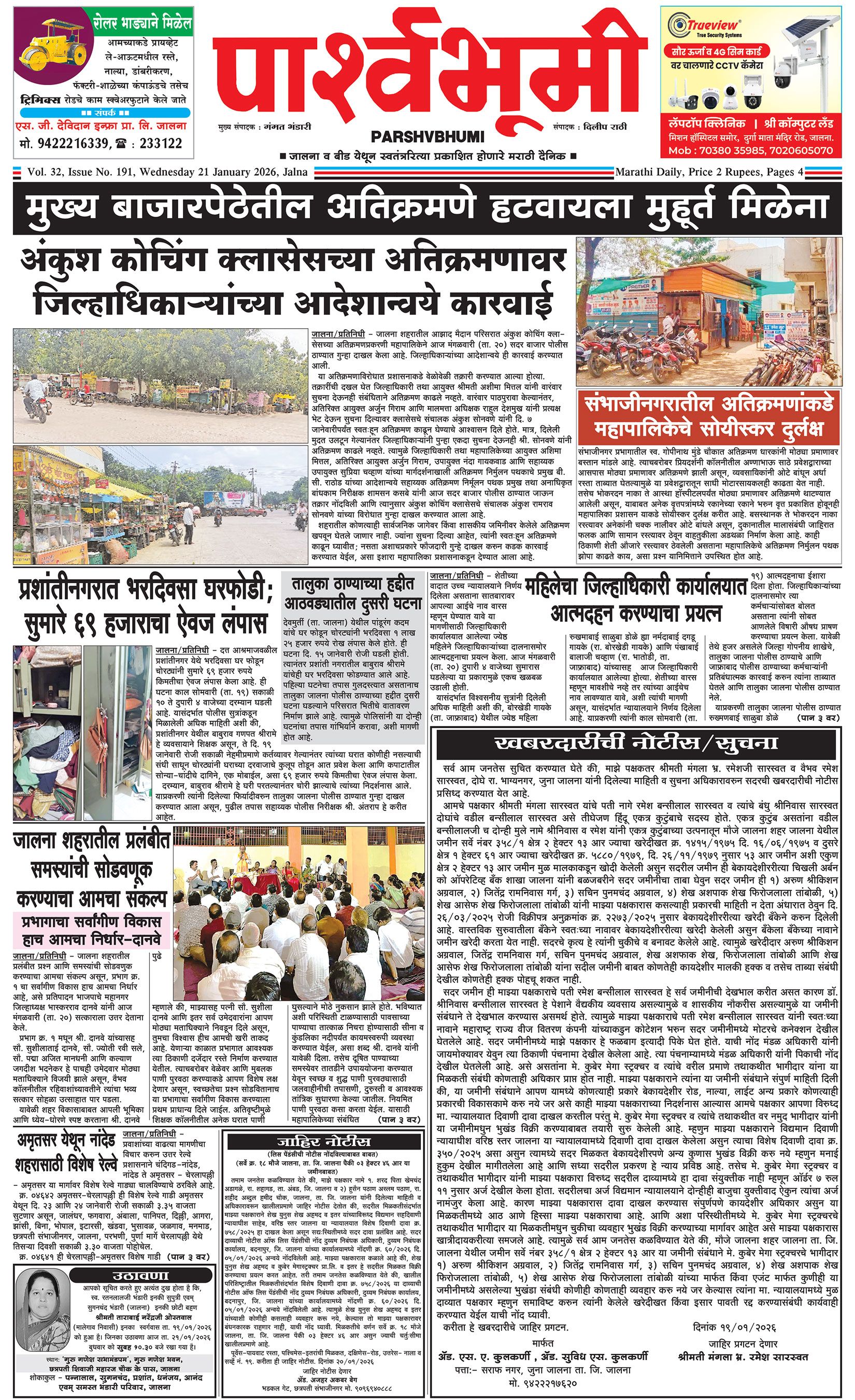 दैनिक पार्श्वभूमी | ‘विधाता’ बिल्डींग, आय. एम. ए. हॉलच्या पाठीमागे, प्रियदर्शनी कॉलनी, संभाजीनगर, जालना | ई-मेल : [email protected] | मो. 9860017155 Page 1 Page 2 Page 3 Page 4 Thursday, 22 January 2026