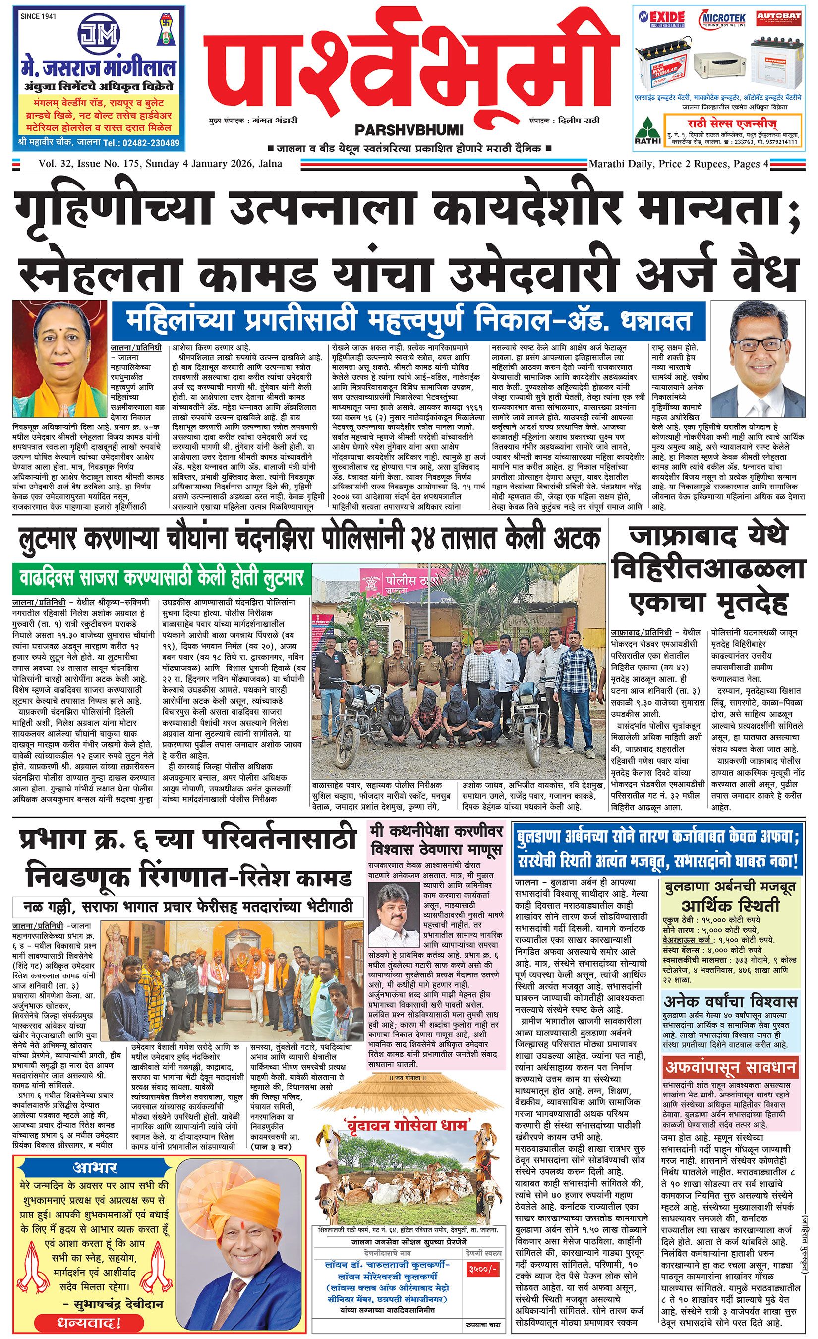 दैनिक पार्श्वभूमी | ‘विधाता’ बिल्डींग, आय. एम. ए. हॉलच्या पाठीमागे, प्रियदर्शनी कॉलनी, संभाजीनगर, जालना | ई-मेल : [email protected] | मो. 9860017155 Page 1 Page 2 Page 3 Page 4 Sunday, 4 January 2026