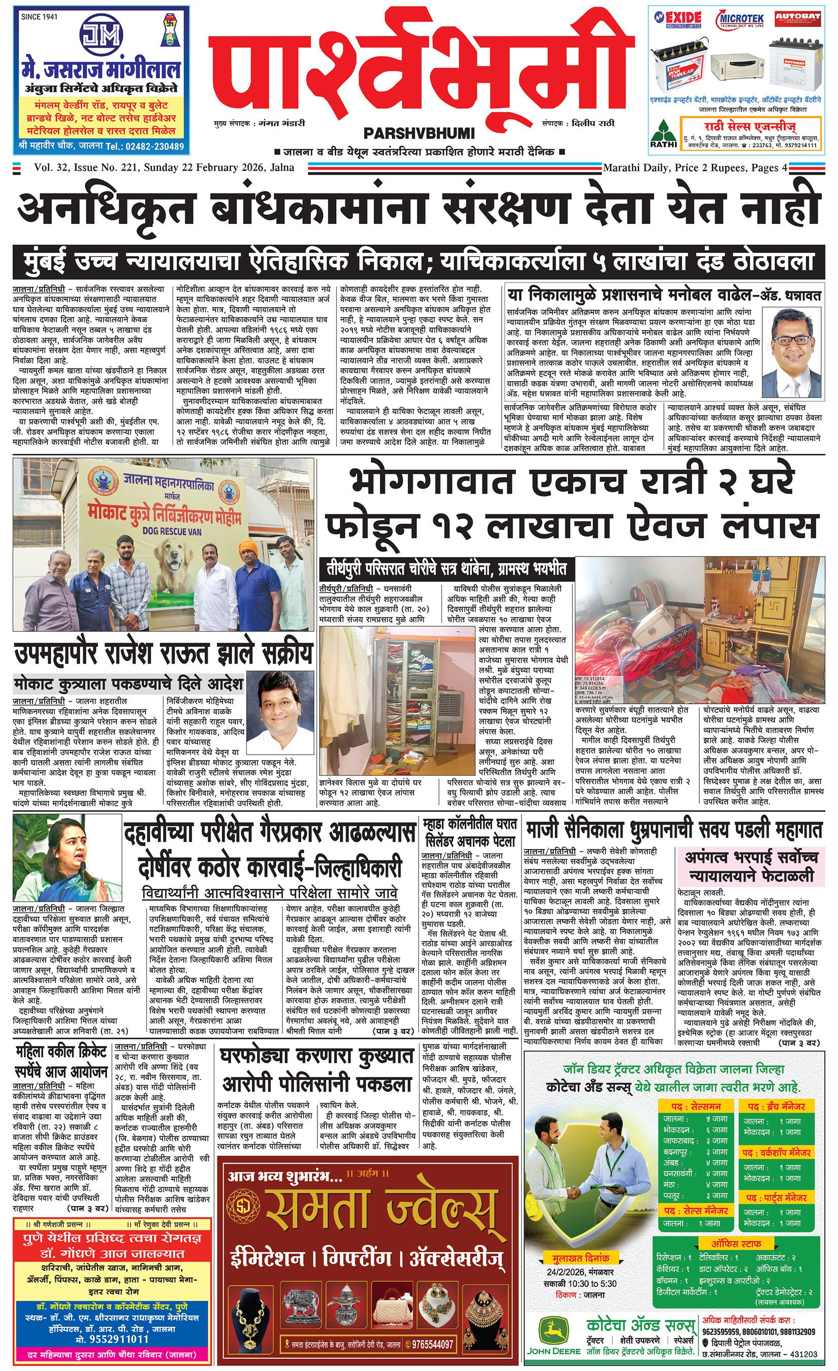 दैनिक पार्श्वभूमी | ‘विधाता’ बिल्डींग, आय. एम. ए. हॉलच्या पाठीमागे, प्रियदर्शनी कॉलनी, संभाजीनगर, जालना | ई-मेल : [email protected] | मो. 9860017155 Page 1 Page 2 Page 3 Page 4 Sunday, 22 February 2026