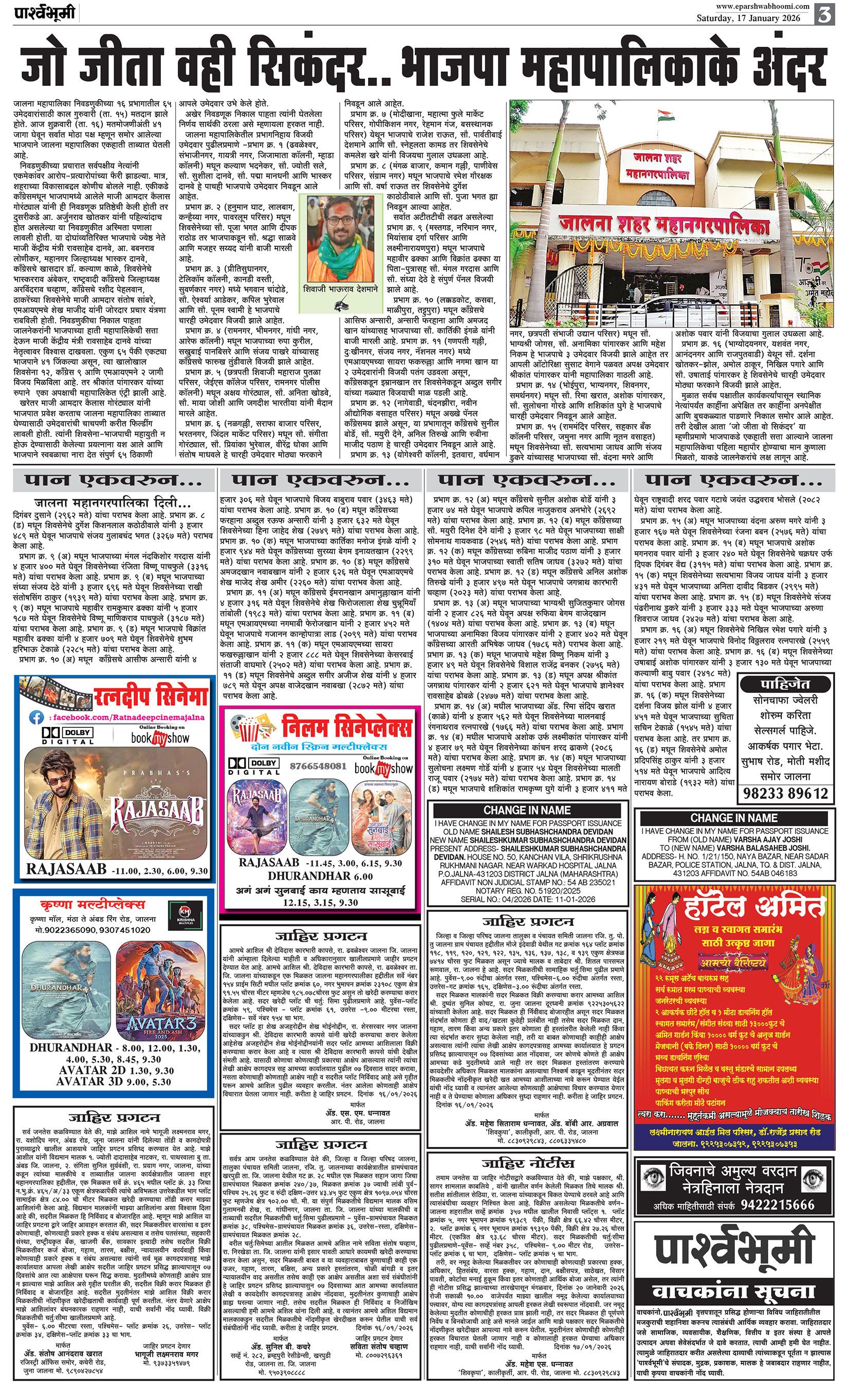 दैनिक पार्श्वभूमी | ‘विधाता’ बिल्डींग, आय. एम. ए. हॉलच्या पाठीमागे, प्रियदर्शनी कॉलनी, संभाजीनगर, जालना | ई-मेल : [email protected] | मो. 9860017155 Page 1 Page 2 Page 3 Page 4 Saturday, 17 January 2026