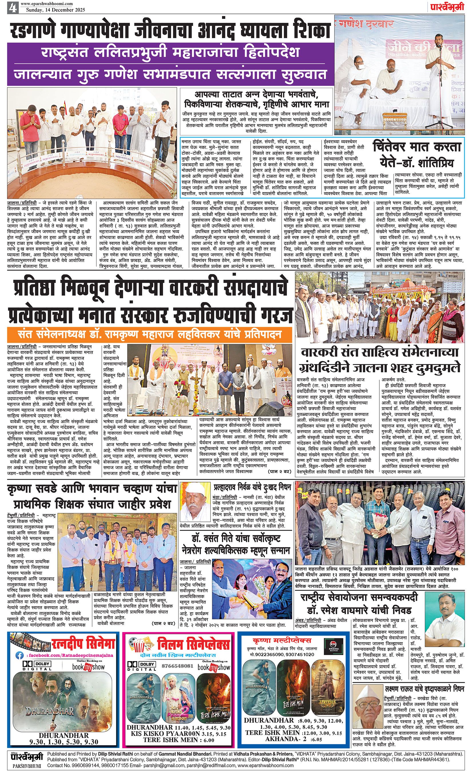 दैनिक पार्श्वभूमी | ‘विधाता’ बिल्डींग, आय. एम. ए. हॉलच्या पाठीमागे, प्रियदर्शनी कॉलनी, संभाजीनगर, जालना | ई-मेल : [email protected] | मो. 9860017155 Page 1 Page 2 Page 3 Page 4 Saturday, 13 December 2025